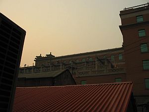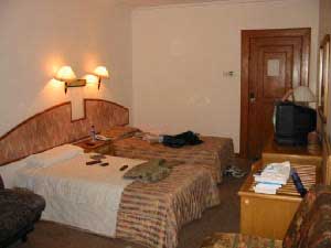 空港の窓口(案内所)で北京市内の宿を確保、リムジンバス降り場までお迎えが来ているとはいえ、ちょっと高めの258元。それでも、超高級ホテル「北京飯店」の裏手という、非常に立地のいい場所。そのおかげか、南向きの窓から見えるのは、北京飯店の高い建物だけ、となりの建物も、北京飯店のリネン室(?)、職員用食堂、みたいなものばかり・・・。