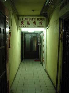 その中でいくつか目星をつけておき、MTRもKCRも駅に近い一つの旅館に行ってみた。交差点の角にある雑居ビルの4階ということだったが、まず建物の入口が分からず、2、3度周りをうろちょろした。GFの内部にエレベータがあることが分かり、店舗の中の細い路地を入っていって、3つあるエレベータの一つに飛び乗ると、4階は通過することがわかった。5階で降りて別のに乗換えるもそれも4階に停まらないのでまたGFまで降りる。こんなことをしながらやっとフロントにたどり着くものの、女将さんが英語が使えず、身振り手ぶりを駆使したりカレンダーをめくったりして、何とか2泊分の話を取り付けたところで2泊分の400HK$を支払って、部屋まで案内してもらった。フロントの奥にも数部屋あったようだが、私の部屋は分室にあたる11階までエレベーターに乗って連れて行かれた。表口のカギを開けて入ると外に面した窓に向かって両側に4部屋ずつある場所の一番奥の部屋に通された。後から考えると、廊下を挟んだ向かいの部屋以外は外に面していないので窓すらないのではなかったのか、と思う。部屋は狭かったが、小奇麗でシャワーとトイレが付いていたし、テレビもエアコンもあったので不満もなく泊まることにした。